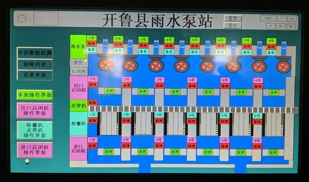 开鲁南部新城雨水泵站在正式交付验收之前,经受住恶劣天气的考验。当地正值7月雨季,阴雨连绵,原有老旧泵站排水不利,城区内多处内涝,交通混乱,险象环生,严重影响城区内百姓正常出行及生产生活。新建泵站虽未正式交付,但是临危受命。新建泵站共8台排水机组,单台机组排水量约2.5m³/S,仅运行2台机组,在(15分钟路面积水排净,半小时内进水管网排空)城区各易涝点雨水就得到有效排放,恢复正常。这也是新建雨水泵站能够顺利通过验收的重要原因。