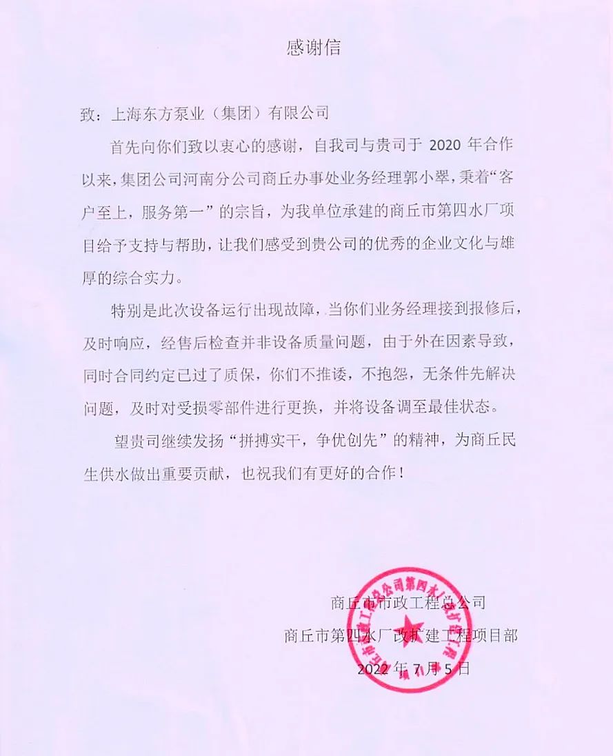 近日,东方泵业收到来自河南商丘市第四水厂改扩建工程项目部的感谢信,感谢东方泵业秉承“客户至上,服务第一”的宗旨,为商丘市第四水厂项目给予支持与帮助。
