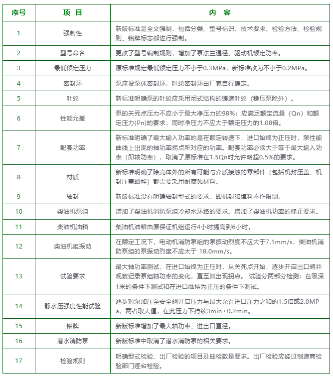 新版《消防泵》标准对固定消防泵组的技术要求进行了系统性优化,涵盖设计、材料、试验、检验等全链条环节,共涉及17项关键技术升级,全面强化产品性能与运行安全: